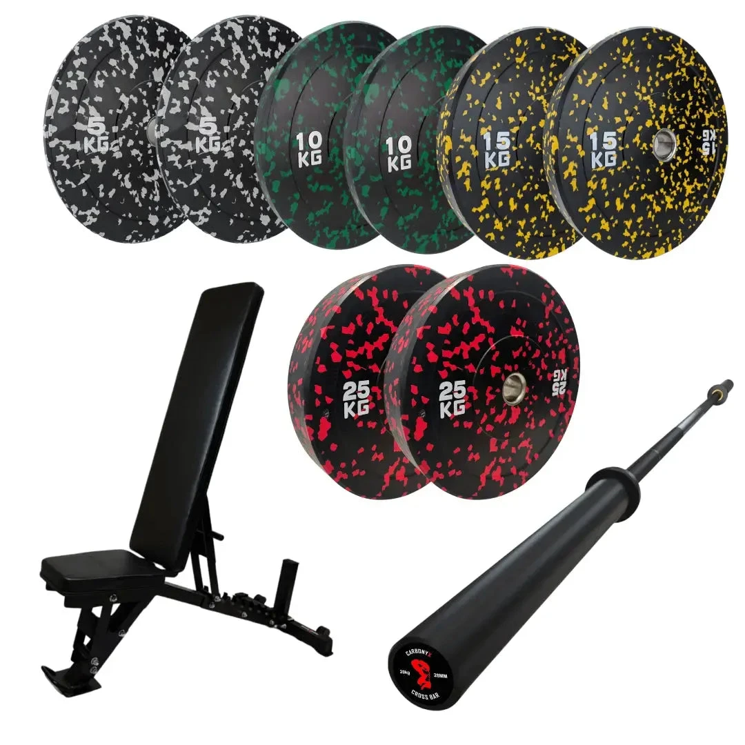 110kg set of Flecked Bumper plates & Black Carbonyx Cross Bar
