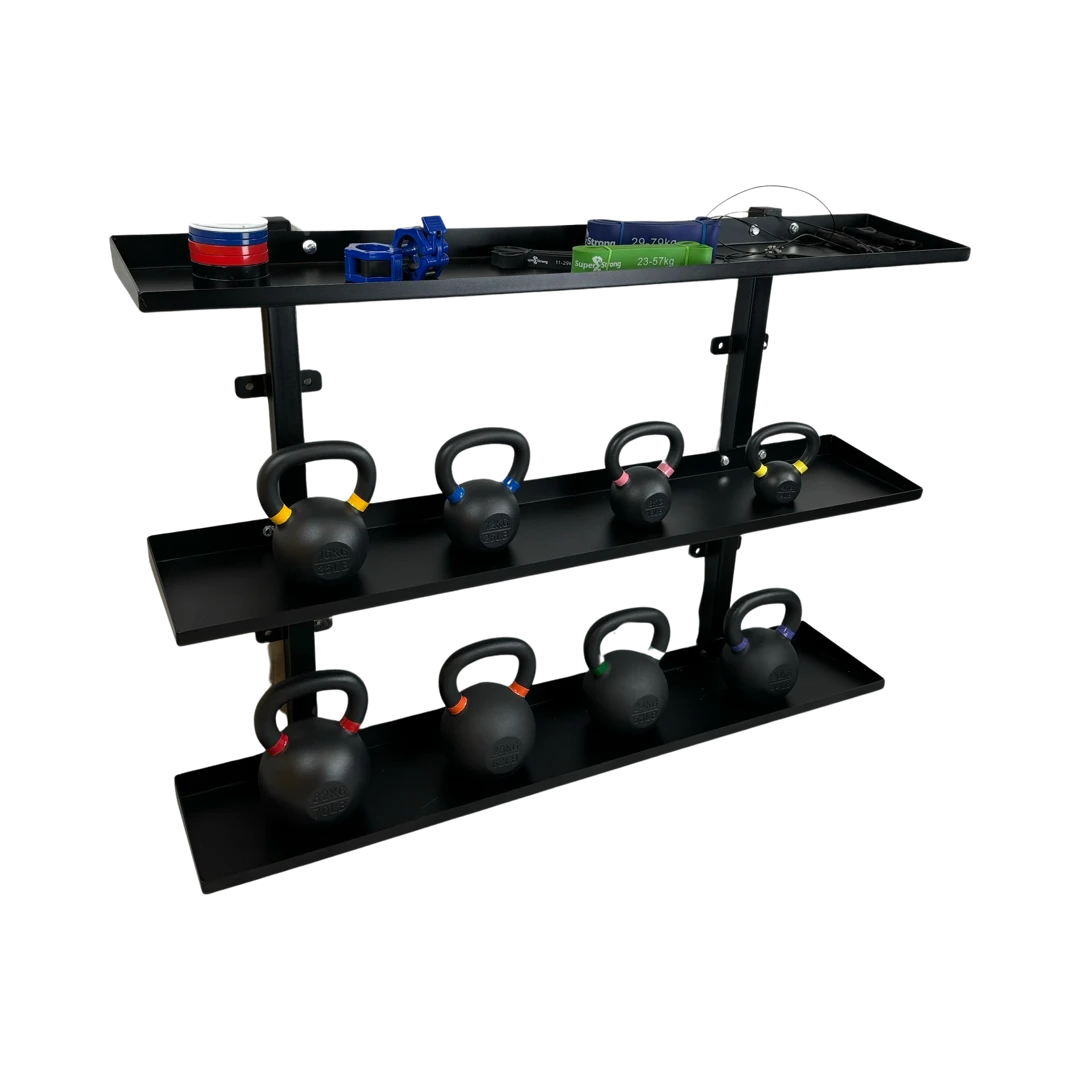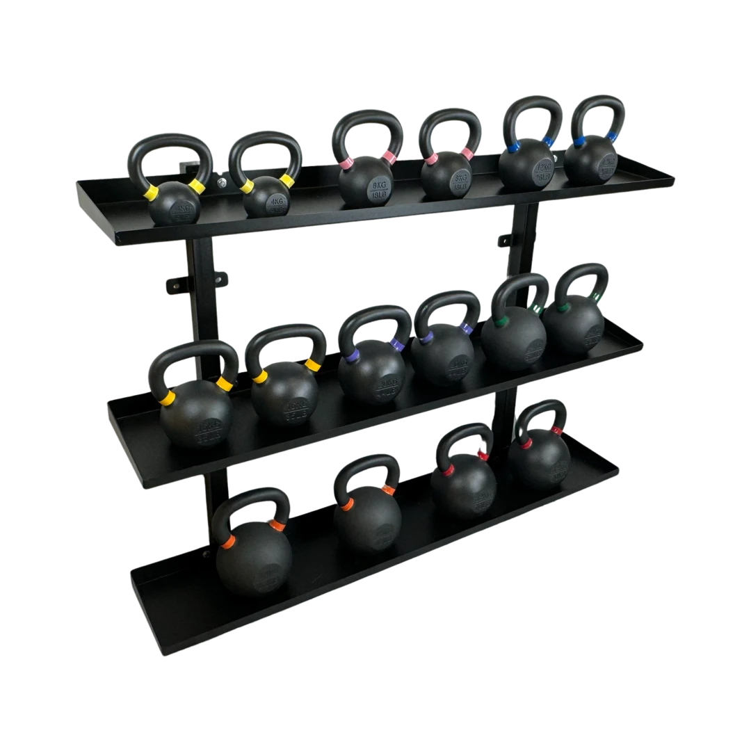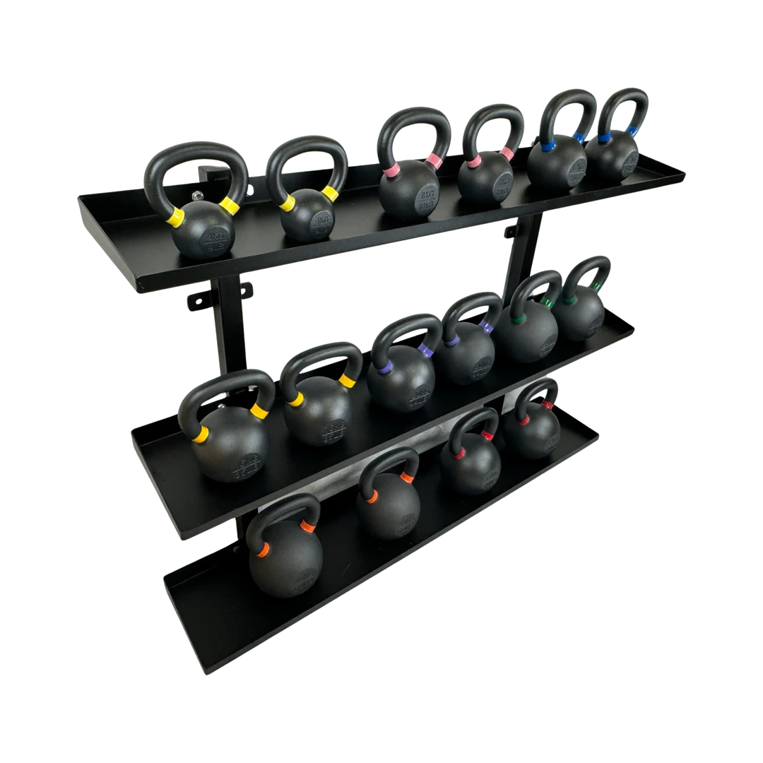 The Heavy Duty Black Powder Coated Steel Wall Mounted Kettlebell Rack is a durable, space-saving solution for organising kettlebells and accessories. This wall-mounted rack keeps kettlebells secure and accessible while freeing up floor space, making it ideal for any gym or home workout area.Â